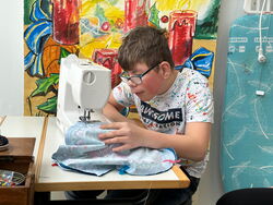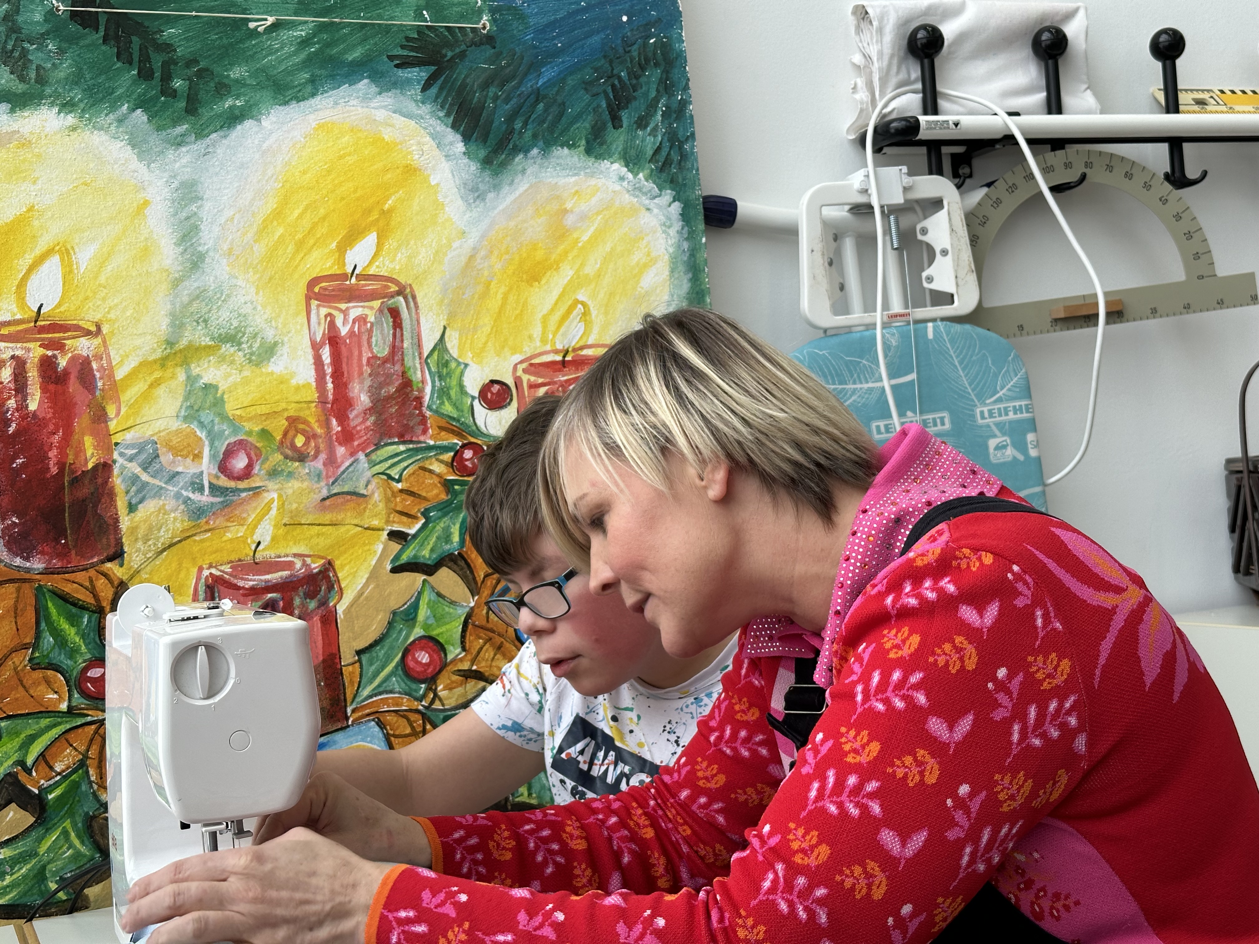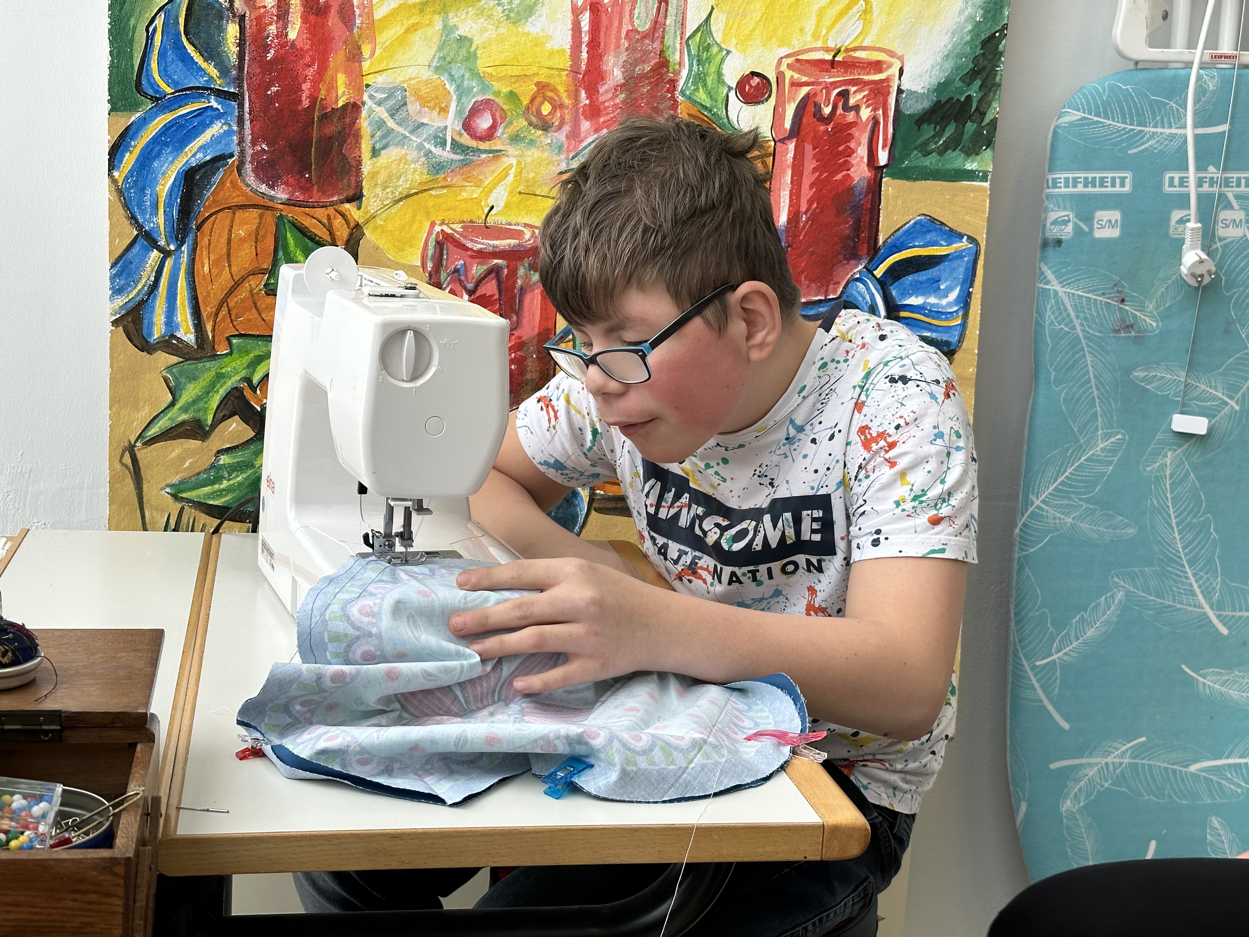Antje Blankenhagen ist als Schneiderin angestellt und bietet für die älteren Schüler*innen regulär Nähunterricht an, der schon für die Werkstattarbeit nach der Schulzeit vorbereitet. Jeden Dienstag und Donnerstag kommen die „Großen“. „Manche arbeiten sehr selbstständig und geschickt mit der Stoffschere und an der Nähmaschine und brauchen keine Unterstützung. Manche brauchen eine 1:1 Betreuung und Handführung an der Maschine. Diese werden dann auch von Lehrer*innen und Betreuer*innen begleitet und unterstützt“, erzählt Antje Blankenhagen – und ergänzt: „Mit den Großen hier wollen wir auch etwas gemeinsam umsetzen. Sie sollen außerdem erleben und spüren, dass sie so, wie sie sind, gut sind, Selbstliebe und eigene Wertschätzung ist ein großes Thema für die Schüler*innen hier, da unterstütze ich mit meinem Angebot, wo ich kann,“ betont sie, die für viele Schüler*innen viel mehr ist als die Schneiderin aus der Werkstatt. „Wir können hier auch mal Tee trinken und dann erzählen die Schüler*innen von ganz alleine und öffnen sich, sie haben wirklich ein großes Vertrauen.“
