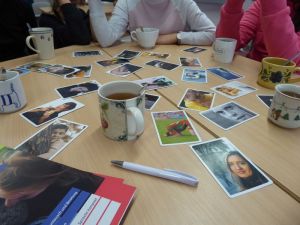 An einem der Montage bin ich zu Besuch. Fünf Mädchen sind schon da, begrüßen mich, fragen neugierig, wer ich bin und was ich mache. Gemeinsam mit Kristina Becker richten sie die Tassen und schenken sich und mir Tee ein.  Es wird viel rumgealbert und gelacht, bis sich alle ihrer Schulsozialarbeiterin zuwenden. Diese hat auf einem Tisch Karten verstreut, die unterschiedliche Motive zeigen: Eine erschöpfter Sportler, eine Kind, das neugierig um die Ecke schaut, eine Frau, die sich in eine Decke kuschelt.  Als Einstieg bittet sie die Mädchen, sich eine Karte zu nehmen, die zu ihrer momentanen Stimmung passt und etwas dazu zu sagen. Keine muss, jede darf etwas sagen, das ist die Regel.  Reihum erzählen die Mädchen, was sie gerade beschäftigt und wie sie sich fühlen. Ein Mädchen fühlt sich hin- und hergerissen zwischen zwei streitenden Freundinnen. Ein Thema, das später noch ausführlicher besprochen wird. Ein anderes platzt damit heraus, dass ein Junge sie gefragt hat, ob sie schon schwanger werden könne.