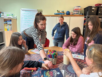 Die Mädchen erzählen mir, dass sie es genießen, einfach mal unter sich sein zu können – „ohne Jungs, die sagen, das ist langweilig, was ihr da macht“. „Hier kann man sich auch einfach mal unterhalten, basteln, malen, Plätzchen backen“. Von Fußballspielen über Schleim herstellen bis zu Mangas zeichnen – die Ideen sind vielfältig und finden ihren Platz am Nachmittag. Die Themen für die Nachmittage entstehen gemeinsam mit den Mädchen. „Zu Schuljahresbeginn haben wir uns erst einmal zu zweit Zeit genommen und Ideen für die Angebote im neuen Schuljahr gesammelt. Im ersten Treffen des Schuljahres haben wir dann mit den Mädchen gebrainstormt und ihre Ideen aufgenommen. Wir schauen regelmäßig im Jahr auf unser gemeinsames Brainstorming-Poster, was wir noch umsetzen könnten“, erklärt Lilian Scherbarth.